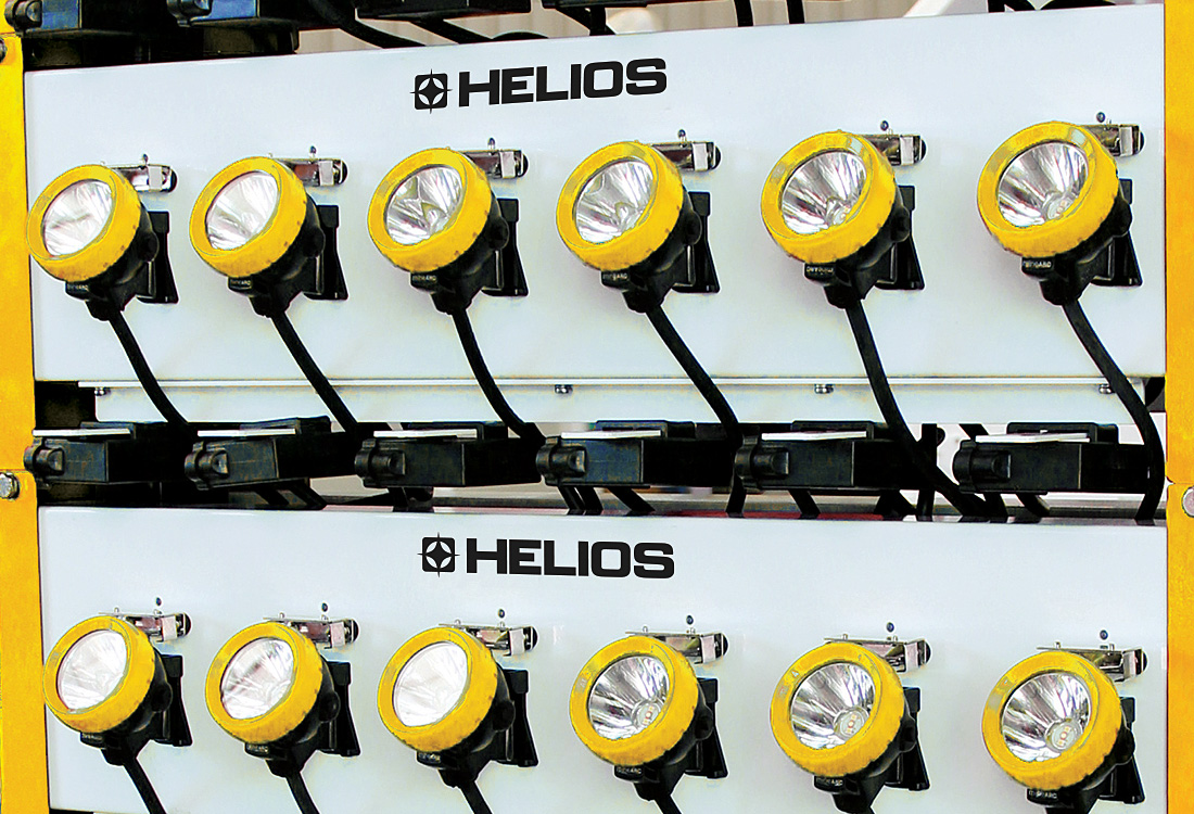 HELIOS corded cap lamps can be recharged via the proprietary HELIOS charging rack range.